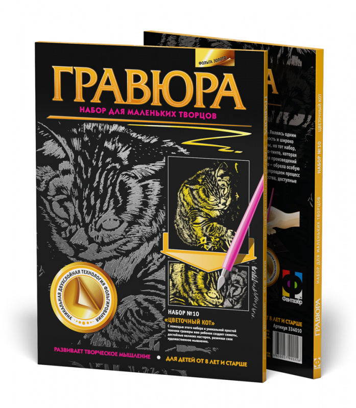Контур рисунка нанесен на черный фон, с помощью специального штихеля изображение процарапывается, и из-под слоя краски появляется основа с разноцветным рисунком.11 видов Разноцветных Гравюр: золотая,серебряная,графическая,радужная