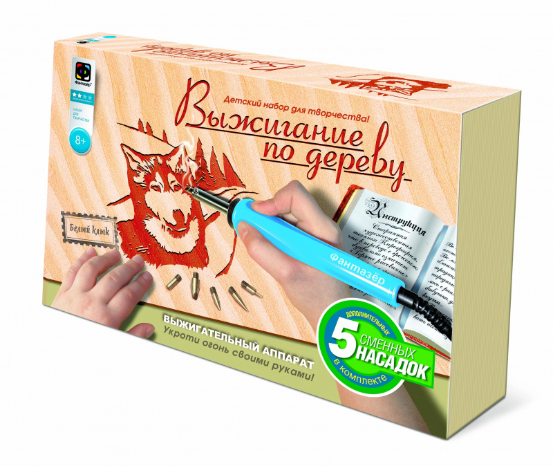 Теперь не нужно думать, как сделать линии более тонкими, где найти подходящий материал для будущей картины - все в этой коробке, Во-первых, это удобный современный выжигательный аппарат с 6 сменными насадками, чтобы вам было легче сотворить именно то, что вы задумали. Во-вторых, это два листа фанеры: один с уже нанесенным сюжетом будущего рисунка, а второй - чистый.