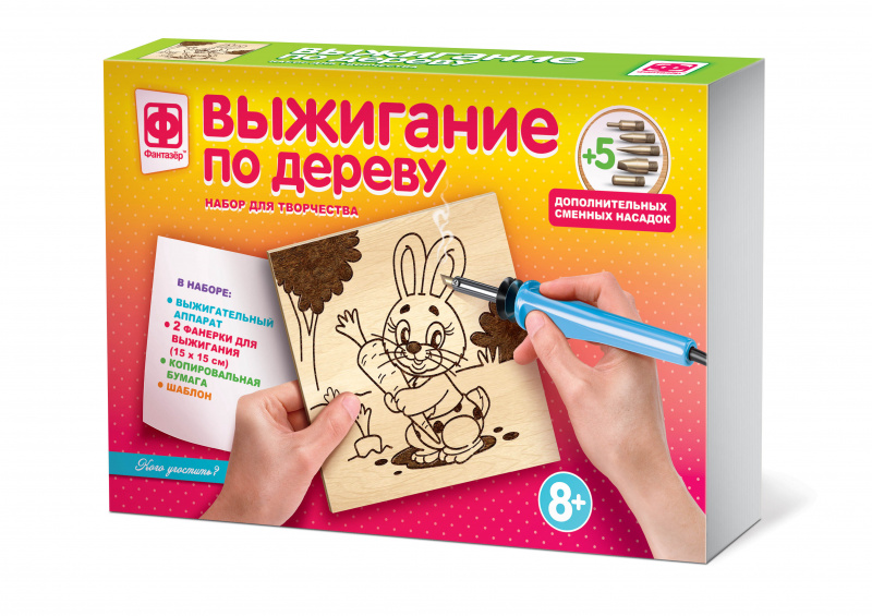 Теперь не нужно думать, как сделать линии более тонкими, где найти подходящий материал для будущей картины - все в этой коробке, Во-первых, это удобный современный выжигательный аппарат с 6 сменными насадками, чтобы вам было легче сотворить именно то, что вы задумали. Во-вторых, это два листа фанеры: один с уже нанесенным сюжетом будущего рисунка, а второй - чистый.