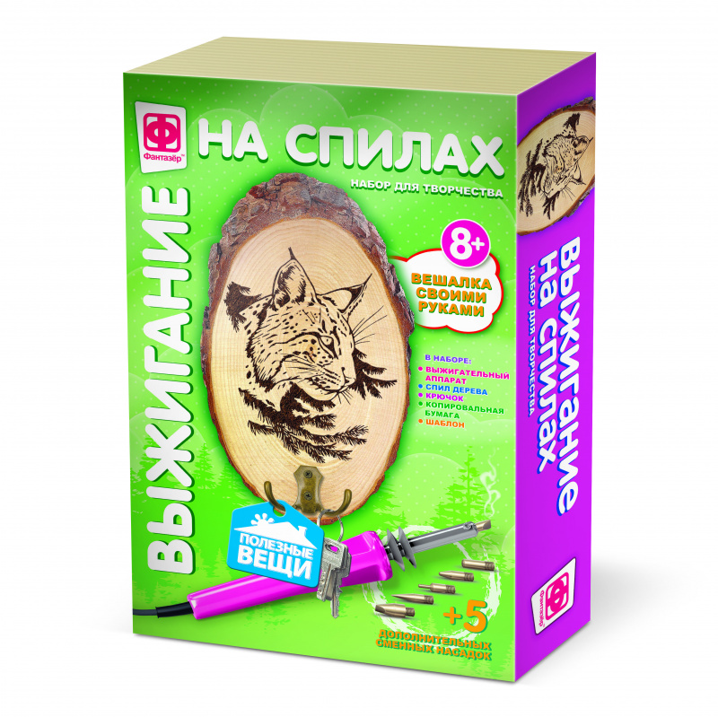 Теперь не нужно думать, как сделать линии более тонкими, где найти подходящий материал для будущей картины - все в этой коробке, Во-первых, это удобный современный выжигательный аппарат с 6 сменными насадками, чтобы вам было легче сотворить именно то, что вы задумали. Во-вторых, это два листа фанеры: один с уже нанесенным сюжетом будущего рисунка, а второй - чистый.