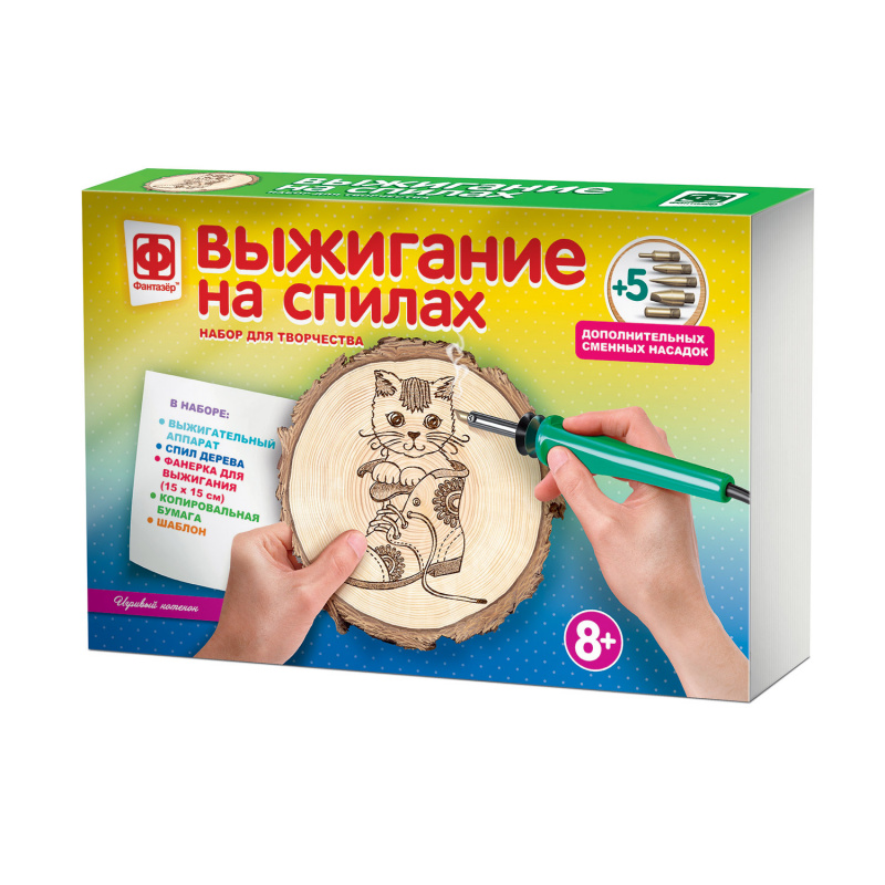 В наборе предусмотрена фанера для тренировки, а также спил дерева, который станет оригинальным украшением интерьера или подарком родным и друзьям, когда маленький художник закончит творческий процесс.
