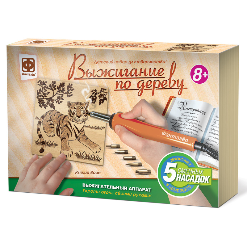 Теперь не нужно думать, как сделать линии более тонкими, где найти подходящий материал для будущей картины - все в этой коробке, Во-первых, это удобный современный выжигательный аппарат с 5 сменными насадками, чтобы вам было легче сотворить именно то, что вы задумали. Во-вторых, это два листа фанеры: один с уже нанесенным сюжетом будущего рисунка, а второй - чистый.