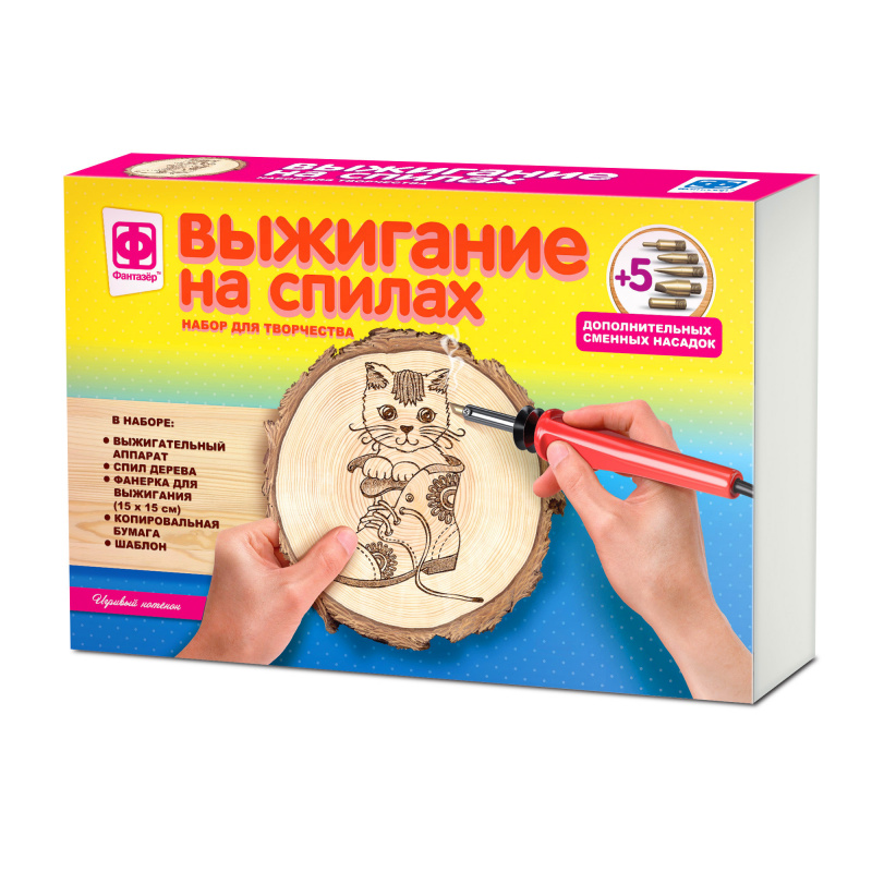В наборе предусмотрена фанера для тренировки, а также спил дерева, который станет оригинальным украшением интерьера или подарком родным и друзьям, когда маленький художник закончит творческий процесс.