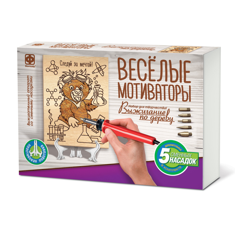 Набор для творчества "выжигание по дереву ВЕСЕЛЫЕ МОТИВАТОРЫ" - это создание с помощью техники "выжигание" забавных деревянных картинок, которые каждый день будут напоминать, что жизнь прекрасна и мотивировать всех членов семьи улыбаться чаще! Особенно если картинку разместить на видном месте или установить на любой полочке с помощью пластикового мольберта.