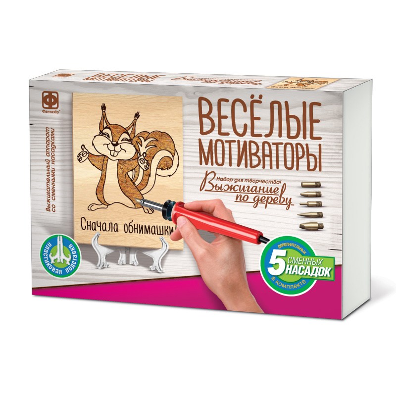 Набор для творчества "выжигание по дереву ВЕСЕЛЫЕ МОТИВАТОРЫ" - это создание с помощью техники "выжигание" забавных деревянных картинок, которые каждый день будут напоминать, что жизнь прекрасна и мотивировать всех членов семьи улыбаться чаще! Особенно если картинку разместить на видном месте или установить на любой полочке с помощью пластикового мольберта.