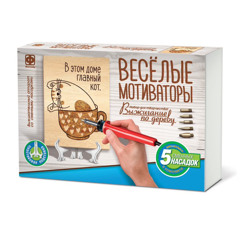 Набор для творчества "выжигание по дереву ВЕСЕЛЫЕ МОТИВАТОРЫ" - это создание с помощью техники "выжигание" забавных деревянных картинок, которые каждый день будут напоминать, что жизнь прекрасна и мотивировать всех членов семьи улыбаться чаще! Особенно если картинку разместить на видном месте или установить на любой полочке с помощью пластикового мольберта.